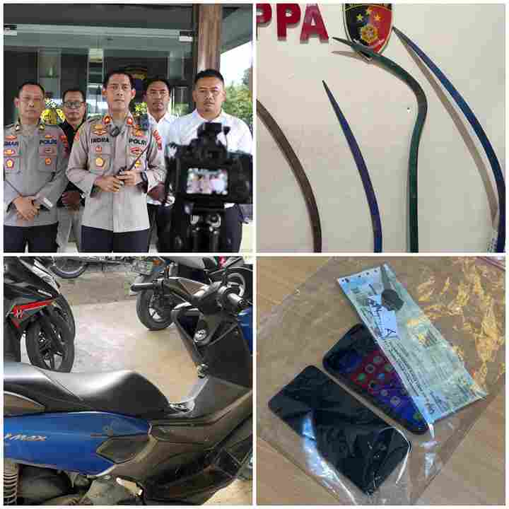 Dalam penindakan di lokasi, polisi mengamankan tiga remaja yang diduga masih berstatus pelajar. Selain itu, sejumlah barang bukti yang disita meliputi beberapa unit sepeda motor, beberapa senjata tajam, dan telepon genggam yang diduga digunakan untuk koordinasi.